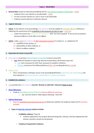HD Evidence Law notes from Fiona Hum's evidence stream Semester 2 2018. Notes are colour coded, highly structured and allow you to quickly address questions using example answer structures. Topics 1-12 with an overview summary as a guide to the notes. 1. Intro 2. Relevance 3. Competence & Compellability 4. Privilege 5. Examination of Witness 6. Character and Credibility 7. Accused’s right to silence 8. Tendency/Coincidence 9. Hearsay 10. Admissions 11. Improperly/illegally obtained 12. Opinion Evidence