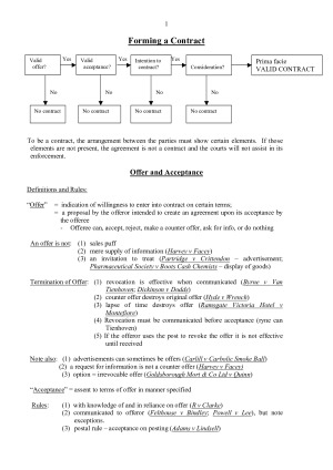 Commercial Law is an OPEN BOOK Exam These notes are my own guide on answering every type of law question, with a step by step guide, structure, and relevant statute and case law. I took these sheets into the exam and was prepared for every question. TORTS • Intentional torts • Negligence • Elements of negligence • Defences to negligence • Nervous shock • Vicarious liability • Negligent misstatement • Impact of legislation (Trade Practices Act) ELEMENTS OF CONTRACT • What is a contract? • Intention for legal relations • Offer and acceptance • Consideration • Capacity • Consent: - Mistake - Misrepresentation (common law and Trade Practices Act) - Unconscionability - Undue influence - Duress - Legality CONTENTS OF THE CONTRACT • Terms • Conditions and warranties • Exclusion clauses • Implied terms • Statutory implied terms • Trade Practices Act (TPA) Part V Div 2 (Rights against sellers) • TPA Part V Div 2A (Rights against manufacturers) • TPA Part VA (Manufacturers liability for defective goods) • Fair Trading Act DISCHARGE OF CONTRACT • Performance • Breach • Frustration REMEDIES • Common law remedies • Equitable remedies