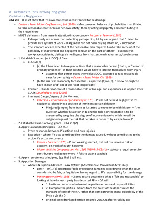 Distinction Level Torts notes from 2018 - all relevant cases, legislation and information to answer questions from all topics. Torts can be a very complex subject to tackle when exam time comes, these notes will cover all the authorities you need to address any question in intentional torts and negligent torts. List of Topics: – Trespass to Person 2 – Trespass to Land and Defences to Intentional Torts and Wilkinson v Downton 4 - Negligence Problem Questions 7 - Established DOC 8 - Novel cases 8 – Negligence: Breach of Duty - 9 - Standard of Care for Professionals 10 - Negligence II: Proof of Breach & Causation 11 - Causation 11 – Negligence: Remoteness of Damage 13 - Mental Harm 14 - Egg Shell Skull rule 14 – Defences to Torts Involving Negligence 15 - Contributory Negligence – 15 - Voluntary Assumption of Risk 16 - Recreational Activities: 17 – Negligence: Categories of Duty of Care 20 – Pure Economic Loss: 24 - Negligent Misstatement 24 - PEL: Negligent Act or Omission 26 – Negligence: Statutory Authorities, Omissions 27 - Statutory Authorities 27 - Omissions 29 - Vicarious Liability: Non Delegable Duties, Concurrent and Proportionate Liability 30 - Employee/Employer 30 - Non-Delegable Duty 32 - Concurrent & Proportionate Liability 33 - Nuisance 34 - Death 37