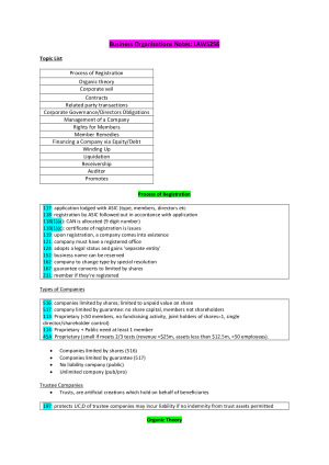 Business Organisations is quite a difficult subject until it ties together at the end. Purchasing these notes will provide you with an overview of all relevant legislation sections, cases and general notes. They will keep you up to date throughout the entirety of the unit. They cover all required material in a condensed, colourful form which is easy to understand. My Business Organisations 2 page cheat sheet for the final exam is also uploaded as a separate document on student vip for $29. If you are interested, this cheat sheet summarises the information within these notes onto only two pages which can be taken into the exam. TOPICS INCLUDE: Process of Registration Organic theory Corporate veil Contracts Related party transactions Corporate Governance/Directors Obligations Management of a Company Rights for Members Member Remedies Financing a Company via Equity/Debt Winding Up Liquidation Receivership Auditor Promoters