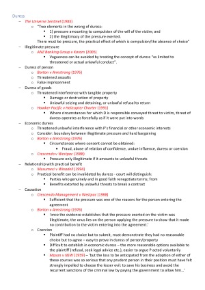 Comprehensive contracts notes with table of contents - covers all relevant cases and all relevant information for all topics, as well as relevant legislation. All information is structured to help answer problem questions in an exam. List of topics: Contract Formation 2 Agreement – Offer/Acceptance 2 Consideration 3 Promissory Estoppel 5 Intention 5 Certainty/Completeness 6 Parties to the Contract 7 Privity 7 Mental Capacity 7 Terms of the Contract 8 Express terms 8 Extrinsic Evidence (Parol Evidence Rule) 9 Implied Terms 10 Interpretation/Construction/Classification 11 Exclusion Clauses 12 Enforceability 13 Formalities/Part Performance 13 Statutory Illegality 16 Consequences of Illegality 18 Proper Consent 19 Misrepresentation (innocent/fraudulent) 19 Misleading and Deceptive Conduct (ACL s18) 21 Duress 24 Undue Influence 25 Unconscionable conduct 26 Undue Influence or Unconscionable Conduct? 27 Third party impropriety 28 Unilateral mistake 29 Rescission and election 30 Discharge/Termination of Contract 32 Performance/Actions for payment 32 Agreement 34 Breach and repudiation 36 Frustration 42