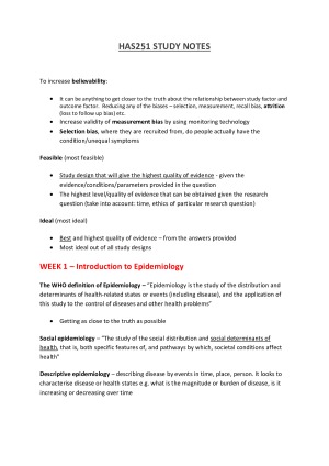 Thorough compilation of study notes from week 1 to week 13 that proved extremely useful for the final exam. Topics include: - Introduction to Epidemiology - Measuring Disease Burden - Observational Studies 1 - Observational Studies 2 - Measurement and Selection Bias - Confounding and Effect Modification - Randomised Controlled Trials - Screening Tests - Evidence pyramid, Systematic Reviews and Meta-Analysis - Biomedical and Population Perspectives