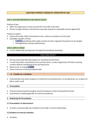 I completed Prop B at Monash in Semester 2, 2018 and received a High Distinction (80). The notes cover all topics that were taught in Sem 2 and include an introductory paragraph for an exam script in addition to the notes. I also have a cover page which has corresponding page numbers for ease of reference. 1. Resulting Trusts 2. Constructive Trusts 3. Estoppel 4. Co-Ownership 5. Creation of Co-Ownership 6. Rights and Duties of Co-Owners 7. VCAT Order for Sales and Division 8. Mortgages 9. Indefeasibility of Title 10. Exceptions to Indefeasibility 11. Unregistered interests under the Torrens System.