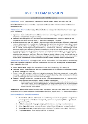 List of topics covered: Week 1 - Introduction to Global Business Week 2 - Going International (Methods and Rationale) Week 3 - Business Environments (Socio-economic) Week 4 - Business Environments (Cultural Diversity) Week 5 - Business Environments (Trade & Investment) Week 6 - Business Environments (Political) Week 7 - Going International II (Theories & Strategies) Week 8 - Global Marketing Week 9 - Foreign Exchange & Risk Management Week 10 - Global Production Week 11 - Ethical & Legal Environments Week 12 - Trade Liberalisation & Economic Integration Overall, I achieved 87% (High Distinction) for this unit. For the exam, this document was my holy grail and must've achieved near 89% from reading the textbook (mostly to grasp some concepts I wasn't 100% sure about)+ repeatedly reading this doc. Hope this helps :) NOTE: The two asterisks (**), beside some headings, are for the pieces of content that the lecturer recommended to place more effort to learn (are presented in one of the last lectures of the semester)
