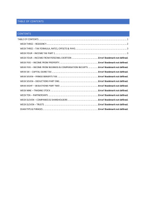 Super condensed tax law notes that I took into my final exam with me. Covers all the main points that you need for an open book exam, if you're just looking for cases, or for really concise notes without all the extra detail that you don't need, then these are the perfect notes for you. (If you do want all the extra detail, check out my other summary notes for Tax Law that cover absolutely everything I did throughout the semester) Topics covered can be seen in the table of contents page in the sample. The notes cover all topics in there (the ones that have no page number is because they aren't included in the sample)