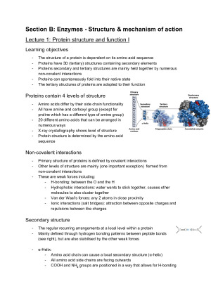 These notes are made from a combination of the lectures and textbooks, and they address all of the learning objectives. Topics and lectures include: Section A: Structure of biological macromolecules - Lecture 1 - Atoms and atomic structure - Lecture 2 - Equilibria - Lecture 3 - Functional groups - Lecture 4 - Chirality - Lecture 5 - Carbohydrates - Lecture 6 - Lipids - Lecture 7 - Amino acids Section B: Enzyme - Structure & mechanism of action - Lecture 1 - Protein structure and function (I) - Lecture 2 - Protein structure and function (II) - Lecture 3 - Enzyme catalysis (I) - Lecture 4 - Enzyme catalysis (I) Section C: Metabolic release of energy - Lecture 1 - Introduction to metabolism - Lecture 2 - Oxidation of carbohydrates (I) - Lecture 3 - Oxidation of carbohydrates (II) & the fate of pyruvate - Lecture 4 - Oxidation of lipids - Lecture 5 - The citric acid cycle - Lecture 6 - Electron transfer & biological oxidation - Lecture 7 - Oxidative phosphorylation Section D: Synthesis of macromolecules - Lecture 1 - Synthesis of glycogen - Lecture 2 - Synthesis of glucose by gluconeogenesis - Lecture 3 - Synthesis of lipids - Lecture 4 - The big picture of metabolism