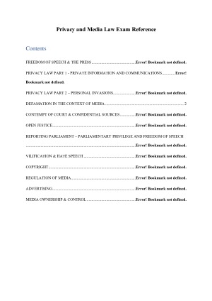 Contents: FREEDOM OF SPEECH & THE PRESS PRIVACY LAW PART 1 - PRIVATE INFORMATION AND COMMUNICATIONS PRIVACY LAW PART 2 – PERSONAL INVASIONS DEFAMATION IN THE CONTEXT OF MEDIA CONTEMPT OF COURT & CONFIDENTIAL SOURCES OPEN JUSTICE REPORTING PARLIAMENT – PARLIAMENTARY PRIVILEGE AND FREEDOM OF SPEECH VILIFICATION & HATE SPEECH COPYRIGHT REGULATION OF MEDIA ADVERTISING MEDIA OWNERSHIP & CONTROL Includes legislation and relevant cases in red where relevant Has an index for easy reference