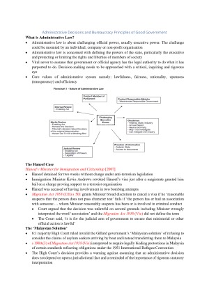 Contents: Administrative Decisions and Bureaucracy Principles of Good Government Administrative Appeals - AAT and VCAT Introduction to Judicial Review Supervisory Jurisdiction and Rights to Judicial Review Rights Under ADJR Act 1977 (Cth) and ALA Act 1978 (Vic) Legitimate Exercise of Legislative and Administrative Power Delegated Legislation, Improper Delegation and Abuse of Discretion Judicial Review - Jurisdictional Error Privative/Ouster Clauses Duty to Act for Proper Purposes/in Good Faith and the Duty to Take Relevant and Not Relevant Considerations into Account Unreasonableness - No Evidence - Other Grounds and Introduction to Procedural Fairness and Natural Justice Procedural Fairness - Right to a Hearing and Right Against Bias Remedies and Standing Obtaining Reasons for Decisions, Freedom of Information and the Office of the Ombudsman ** VERY DETAILED NOTES WOULD NOT HAVE GOTTEN THROUGH THE EXAM WITHOUT THEM Legislation in red where relevant Index page for easy navigation