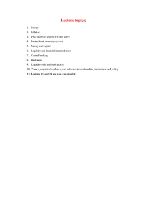 Topics covered: 1. Money 2. Inflation 3. Price surprises and the Phillips curve 4. International monetary system 5. Money and capital 6. Liquidity and financial intermediation 7. Central banking 8. Bank risks 9. Liquidity risks and bank panics 10. Theory, empirical evidence, and relevant 11. Australian data, institutions and policy Lecture 23 and 24 are non-examinable Detailed illustration of Money and Banking key concepts and key to get H1 in Microeconomics. Some key concepts are illustrated in Chinese again for deeper understanding for non-native speakers