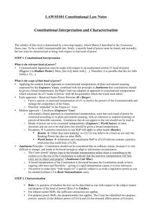Topics covered are examinable: 1. Constitutional interpretation and characterisation 2. Trade and commerce power s51(i) 3. Corporations power s51(xx) 4. Grants power s96 5. External affairs power s51(xxix) 6. Defence power s51(vi) 7. Implied freedom of political communication 8. Judicial power Ch III 9. Intergovernmental immunities 10. Inconsistency s109 Notes have been structured to include step by step guidance on answering problem questions. Grade: Distinction