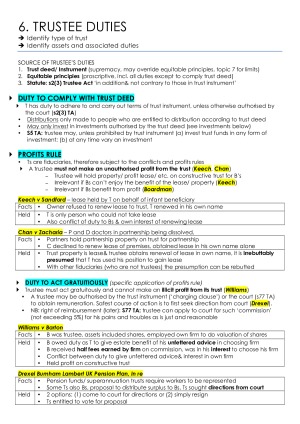Comprehensive exam notes designed to easily navigate questions during the exam. TOPICS COVERED: All 1& 2 - Classification& Certainty 3 - Trust Structure& Objects 4 - Formalities 5 - Constitution 6 - Exercise of Power& Discretion 7 - Defences& Limitations on Liability 8 - Rights of Trustees 9 - Rights of Beneficiaries 10 - Remedies MATERIAL COVERED: Combines and condenses lectures, lecture notes, case summaries, Trustee Act