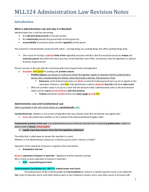 Concise and neatly presented notes with up-to-date content for MLL324 or any administrative law unit. Notes are fully paginated with colour highlights for cases, legislation, critical points and useful exam advice/sample answers. All unit topics covered as listed below: - Introduction - Merits Review and the AAT - Judicial Review - Scope of Powers - Grounds of Judicial Review and Procedural Fairness - Limits on Judicial Review - Improper Exercise of Power - Consequences of Unlawful Action