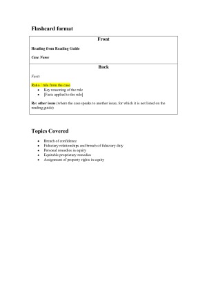 Help! The equity exam is closed book, what on earth do I do!?! How on earth do you study for a closed book exam? How do you do well in a closed book exam? Given their rarity, closed book exams can be difficult to prepare for and will require a slightly different study technique—yes, some memorisation (unfortunately, you will need to spend a little bit of time mindlessly memorising things). The following flashcards break each case/piece of legislation down to its simple facts and a simple principle, which can easily be memorised. If you are able to cram these principles into your brain you should be able to answer exam questions well (and quickly). Memorisation is not the most exciting process, however, it is easier than it sounds—there are actually fewer pieces of information in the course than you think, the facts of the cases are easier to remember than you initially think, and it is surprising how quickly your brain can absorb information into its short-term memory (on the morning of the equity exam, I still had around 20% cases that I was unsure of—it only took a couple of hours of going through the cards to get on top of them). I wrote each case on a 6” x 4” index card (from Officeworks), using a different colour card for each of the 5 topics. Whether the exam is weeks or months away, or even just a few days away, creating flash cards like these will be one of the most valuable things you can do to prepare for the closed book exam. I’ve used this technique for each of the 4 closed book exams I have done at law school and managed to HD them all. You can also do it! Hope you find the notes helpful and best of luck for the exam! Topics included: • Breach of confidence • Fiduciary relationships and breach of fiduciary duty • Personal remedies in equity • Equitable proprietary remedies • Assignment of property rights in equity