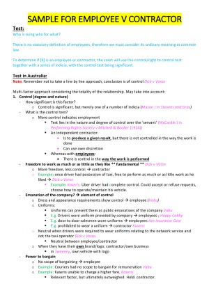 I used only these notes to achieve a 85 in employment law. The notes are very structured and colour coordinated which will help you under the time pressure of the exam. If you require further detail, some topics have cases in extra detail underneath. The following topics are covered: 1. Contractors v employees - Why the difference matters - The test - Unfair contracts for contractors - Sham contracting - Accessorial liability, franchisor responsibilities, and joint liability 2. Forming an employment contract - Key and optional terms in employment contracts - Formation of employment contractors - Types of employment - Flexible work arrangements 3. Sources of Employment Regulations and Minimum Employment Standards - National Employment Standards - Modern Awards - Enterprise Agreements 4. Terms of Employment Contracts - Express terms - Companies policies and procedures as terms of employment contracts - Implied terms - Varying the terms of employment contracts - Employment contracts and NES, MAs, and EAs 5. Employee duties - General principles and background - Duty to obey lawful and reasonable orders - Out of hours conduct - Duty of fidelity and good faith - Duty to exercise reasonable care and skill - Duty requiring employees to hold inventions created in the course of performing their employment . - Duty not to misuse or disclose confidential information - Post-employment restraints or restrictive covenants) - Mutual duties 6. Employer's implied duties - Wage setting - Work/wages bargain - Duty to provide work 7. Unfair dismissal - Time limit - Jurisdiction requirements - Remedies - Process 8 part 1. Termination at common law 8 part 2. Remedies for termination at common law 9. General protections (adverse action) - The rule - Procedure - Costs - Remedies - Other claims (coercion, undue influence, pressure, misrepresentation, industrial action protected, protection against discrimination). 10. Anti-discrimination and bullying protections - Includes notes for vicarious liability for sexual harassment and victimisation