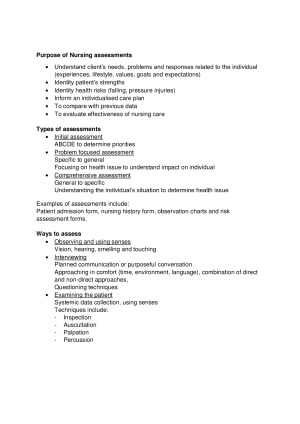 These notes cover the whole course. Basically an overview on all the topics that will be tested in the exam. Quick tip! Do not study every topic in detail. You only need to have an understanding of what the topic covers. The tables with definitions really helped me improve my vocabulary and also answer definitions in the exam. Topics covered: The major content areas in the unit outline *Chain of infection; precautions; microorganisms, PPE * Patient bed positions *Nursing process *Clinical reasoning cycle *Nursing health history *Purpose of nursing assessments; types of assessments *Data *falls risk; pressure injury *Nutrition *Fluid balance *Stoma care *Vital signs *ISBAR IDAR *Gibbs reflective cycle