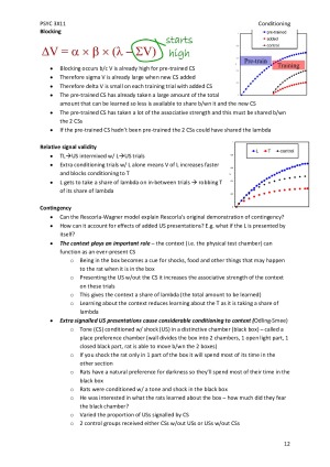 I made these notes using all lecture material, and readings (including from the Bouton textbook 'Learning and Behaviour') for the Conditioning topic (Justin's lectures). Studying with my extensive notes will enable you to get a mark like mine or higher!! These notes are extremely detailed and provide you with all the information you need for this topic in the final exam and tutorial quizzes. Note: the lecture content and final exams for PSYC3011 and PSYC3911 are identical so these notes would be perfect for students completing either stream of Learning and Behaviour. Lecture topics included in these notes: Lecture 6 – The content of conditioning Lecture 7 – The conditions for conditioning: What are the necessary and sufficient conditions for learning? Lecture 8 – Contingency Lecture 9 – Models of conditioning: The Mackintosh model, and introduction to the Rescorla-Wagner model Lecture 10 – Rescorla-Wagner models of conditioning Lecture 11 – Extinction of conditioning: The Rescorla-Wagner model’s take on extinction and where the model falls short Lecture 12 – Inhibition: What is inhibition and how is it acquired according the Rescorla-Wagner model? What is its relationship to extinction? Lecture 13 – Latent inhibition: What is latent inhibition? What is its relationship to conditioned inhibition or extinction? How can it be explained? These lecture notes include detailed information on how to do Rescorla-Wagner model questions for different experimental paradigms ( blocking, overshadowing etc.), which is very important for the tutorial quiz.