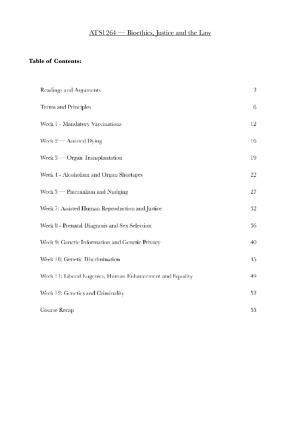 Comprehensive, in depth notes and lecture notes for ATS1263. Includes summary/recap of course, plus summary of readings referenced throughout the semester. As well as a "terms and principles" section. 50+ pages covering topics: - Mandatory Vaccinations - Assisted Dying - Organ Transplantation - Alcoholism and Organ Shortages - Paternalism and Nudging - Assisted Human Reproduction and justice - Parental Diagnosis and Sex Selection - Genetic Information and Genetic Privacy - Genetic Discrimination - Liberal Eugenics, Human Enhancement and Equality - Genetics and Criminality
