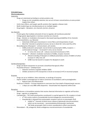 - Comprehensive yet concise set of notes for Sydney University PCOL2605 (2014) - Covers all lecture content, but has been summarised and re-explained for clarity - Clear, organised and easy to understand dot-point format, with tables and figures as learning aids - Enabled me to obtain an HD for this subject - Topics include: pharmacodynamics, drug receptors, autonomic nervous system, glaucoma, acetylcholine and noradrenaline, CNS neurotransmitters, mood disorders, anaesthesia, opioids and analgesia, RAAS, hypertension, heart failure, angina, cardiac dysrhythmias, dyslipidaemia, diuretics, asthma, NSAIDs, paracetamol, ADRs, drug interactions, complementary medicines, histamine, allergic rhinitis, autacoids, heavy metal poisoning, cannabinoids.