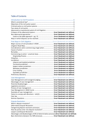 Comprehensive notes covering the whole semester of material. Formatted in an easy to follow manner - perfect for exams. Topics include: - Intro to civil procedure - First steps in civil litigation - Case management - Dispute resolution - Service - Preserving the status quo pending trial: interim preservation - Parties - Putting the case together (including pleadings, particulars, discovery, interrogatories, notices to produce, subpoenas, expert evidence) - Ending the case (including offers of compromise, security for costs, settlement and discontinuance, summary disposal, enforcement) - Mistakes and amendments - Costs - Appeals Also includes a refresher section on common contract and tort causes of action for help in problem type questions.