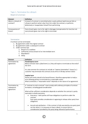 The notes include the following topics, in addition with case summaries and authorities: - Termination for a breach -- Breach of a contract -- Termination - Termination for repudiation and delay -- Repudiation -- Delay - Consequences of affirmation or termination and restrictions on the right to terminate -- Termination v Affirmation - Measure of damages --Damages -- Limitations on the award - Liquidated damages, specific performance and injunctions -- Liquidated damages / penalties -- Specific performance -- Injunctions -- Equitable damages - Restitution and action for debt -- Restitution -- Action for debt -- Payment independent of performance - Frustration - Abuse of power -- Vitiating factors -- Abuse of power - Remedies for vitiating factors under common law: rescission and statutory unconscionability -- Remedies for vitiating factors -- Statutory unconscionability - Misleading and deceptive conduct -- MDC v statutory unconscionability - Remedies for vitiating factors under statute -- Statutory remedies