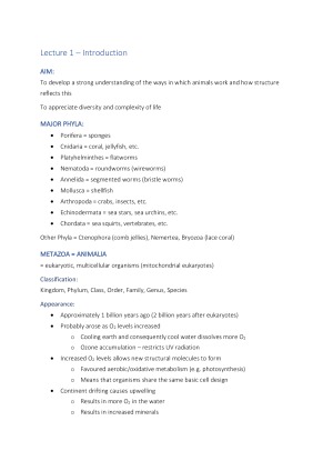 Hello fellow students, these notes include the first 10 lectures covering the following topics: Introduction to Classification and Animal Structure Porifera and Cnidaria Worms Annelids Platyhelminthes and Nematodes Molluscs Skeletons Arthropods and Insects Crustacea and Chelicerates Notes are presented in a structured format with headings, dot points and diagrams to improve understanding of each topic. They combine information from the lectures and practical classes, as well as relevant details from the prescribed textbook.