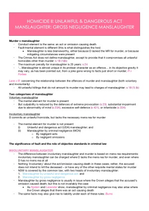 These are complete notes for criminal law that allowed me to obtain a distinction grade. It includes: 1. Full notes --> full, unedited notes. 2. Summary --> all the necessary information needed for the exam is summarised. This makes it easier to study and to flick through during the open-book exam. The summary is done like a flowchart, to guide you through each step of the problem question easily. See the preview for an example. The notes have been complied using lecture slides, attending tutorials, reading the textbook (both the prescribed ones and I also used the Penny Crofts summary book) and my own independent research/others' notes. Topics included: all topics included in the full notes except notes for sexual offences: there are some notes in the summary but this was omitted as no question could be asked on it in the final exam. The topics are listed as per below: - Crime, law and morality - The scope and principles of criminal law - The elements of criminal offences - Homicide I: murder - Homicide II: unlawful and dangerous act manslaughter; gross negligence manslaughter - Assault offences: common assault and compound and aggravated assaults + wounding offence - Larceny - Complicity - Extreme provocation - Self defence and excessive self defence - Duress and necessity - Mental illness and substantial impairment by abnormality of mind (SIAM) - Automatism (involuntariness) -The use of evidence of mental illness or self-induced intoxication The preview contains extracts from the full notes and the summary notes. Note they are not in page order.