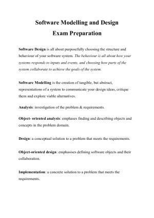 This Note for Software Modelling and Design is used for revision purposes. It contains all lecture+tutorial topics from week 1 to week 12. It acts as a "cheat sheet" for this subject, and is a compact summary of key contents across the semester. Contents include: * Basics and intro of SMD * Pattern Introduction * Use cases * Domain models * System Sequence Diagram * Design Sequence Diagram * Class Diagram * UML Interaction * GRASP Principles (IMPORTANT) * Visibility, Code * State Diagram * Test, Refactor * Design patterns (IMPORTANT) I did this subject last semester and achieved H1. It is super useful in real exams and many topics covered in this note appeared in final exam. Spend a week on it to get easy H1 :)