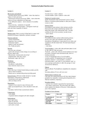 INCLUDES CONCISE NOTES FOR ALL WEEKS 1-13 LECTURES AND LECTURER COMMENTARY (1-2 weekly lectures). No irrelevant note components attached. CONTENT OF NOTES INCLUDE: Lecture 1 - Microscope types Lecture 2 - Plant cell structure and components Lecture 3 - Structural importance of plant tissues and organs Lecture 4 - Root anatomy Lecture 5 - Stem and leaf anatomy Lecture 6 - Responses to the environment Lecture 7 - Secondary functions and responses Lecture 8 - Flower components and pollination Lecture 9 - Internal cellular structures and functions Lecture 10 - Membranes and intreceullular functions Lecture 11 - Starch and sucrose synthesis Lecture 12 - Impacts of the environment and associated stress Lecture 13 - Amino acid synthesis Lecture 14 - Light reactions (Photosynthesis I) Lecture 15 - Calvin Cycle (Photosynthewsis II) Lecture 16 - Glycolysis and fermentation Lecture 17 - Oxidative pentose phostphate pathway and citric acid cycle Lecture 18 - Mitochondrial electron transport synthesis Lecture 19 - Respiration in intact plants and tissues Lecture 20 - Nitrogen assimilation Lecture 21 - Nitrogen fixation, sulfur and phosphate assimilation Lecture 22 - Plant molecular biology I - genome structure and replication Lecture 23 - Plant molecular biology II - transcription