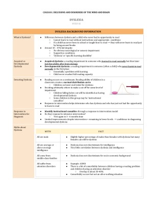 Grade: HD (86) Organised and detailed notes containing both lecture and tutorial content. Easy to understand and follow. Content: Week 1: Course Introduction Week 2: Dyslexia Week 3: Aphasia Week 4: Specific Language Impairment Weel 5: Autism Week 6: Synaesthesia Week 7: Amnesia Week 8: Disorders of the Self Week 9: Agnosia Week 10: Delusions Week 11: Schizophrenia Week 12: Modelling Delusions with Hypnosis