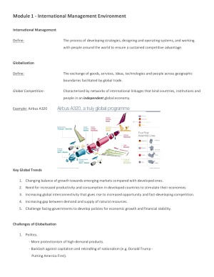 Full detailed exam notes for Modules 1-11 which helped me achieve a distinction mark. Topics involved include: Module 1 - International Management Environment Module 2 - Social Responsibility and Ethics Module 3 - The Role of Culture Module 4 - Communicating Across Cultures Module 5 - Cross-Cultural Negotiation and Decision Making Module 6 - Global Strategic Management and Alliances Module 7 - Global Alliances and Strategy Implementation Module 8 - Global Organisation Studture and Control Systems Module 9 - Global Human Resources Management - International HRM Module 10 - Expatriate Management Module 11 - Motivation and Leading Across Cultures (Module 12 consisted of revision work)