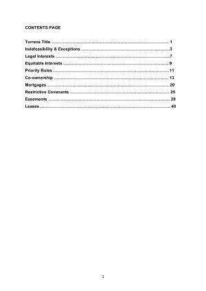 These are comprehensive notes on the following topics: - The Torrens System - Indefeasibility & Exceptions - Legal & Equitable Interests - Priority Rules - Co-ownership - Mortgages - Covenants - Easements - Leases I received HD marks throughout the semester and the quality of these notes reflect this!!