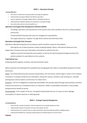 Topics included in this notes: Operations Strategy, Manufacturing Processes, Service Processes, Strategic Capacity Management, Aggregate Capacity and Operations Planning, Material Requirements Planning, Inventory Management, Global Sourcing Management + Logistics, Quality Control, Quality Management and Improvement and Lean/JIT Operations. Definitions and concepts are thoroughly described in these notes. It is in a weekly format which is handy for exam periods.
