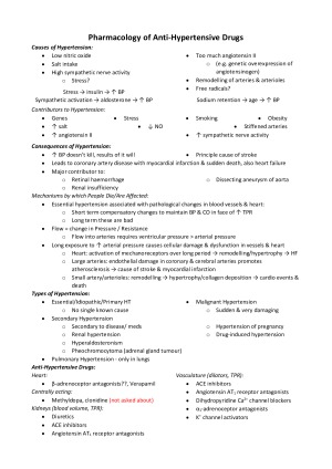 Concise and summarised notes from Week 1 - 12. Easy to read and saves time reading through slides from thick lecture notes. Topics covered: pregnancy & breastfeeding, geriatrics, paediatrics, laboratory monitoring, epidemiology of cardiovascular diseases, cardiovascular pathophysiology, pharmacology of anti-hypertensive drugs & heart failure drugs & anti-arrhythmic drugs, pharmacology of drugs used in clotting disorders & ischaemic heart diseases, pharmacology of diuretics, hypertension and hyperlipidaemia therapeutics, MI therapeutics, Atrial fibrillation and cardiomyopathy therapeutics, chemistry of drugs used in cardiovascular disease. Enjoy!