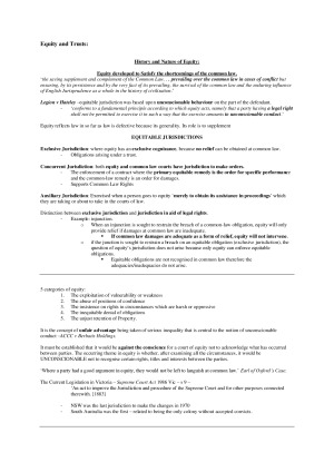 Here is everything you need for your equity and trusts exam. History of Equity Equitable interests assignment Trusts and its certainties undue influence, estoppel and unconscionable conduct charitable trusts resulting trusts tracing constructive trusts remedies