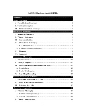 The notes combine exam and case notes, fully indexed with bookmarks and headings, and therefore easy to navigate between sections. In the exam notes, the author adopts a partisan approach and includes in one topic must-have statement as well as counter-arguments the other party might raise in the hypo. It also includes the lecturers' wisdom when commenting on past exams. The exam note covers the 12 weeks' learning including the following topics: 1. Solvency / Bankruptcy assessment 2. Commencing bankruptcy - Involuntary bankruptcy - Voluntary bankruptcy - Alternatives to bankruptcy - Discharge - Annulment 3. Consequence of bankruptcy - Personal impact - Vesting of property - Deprivation of right to pursue provable debts - Stay of legal proceedings 4. Recovery Proceeding in bankruptcy - Undervalued transactions - Transfer to defeat creditors - Preferences 5. Alternative to liquidation - Voluntary winding up - Voluntary administration - Receivership 6. Commencing liquidation (most importantly, wound up on insolvency) 7. Consequence of liquidation 8. Priority in distribution 9. Recovery proceeding in winding up - Voidable transaction - Transaction defeating employee entitlements - Circulating security interest - Security interest in favour of officer - Insolvent trading The case note covers 12 weeks' cases in the foregoing topics. The author also sells exam and case notes for Insolvency Law separately on StudentVIP.