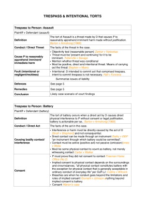 Basically, an Idiots Guide to Torts. These notes got me a distinction on the closed book exam. They are by no means the most comprehensive set of notes, they are not designed to replace weekly readings, they are designed to help drill in information in short sentences so that you can REMEMBER IT for the CLOSED BOOK EXAM. I have also included tips for how I achieved my mark in the exam. The topics included are: Intentional torts - Trespass to person - Trespass to land Negligence - Duty of care - Concurrent liability (vicarious liability) - Breach of duty - Damage and factual causation - Remedies (Damage$)