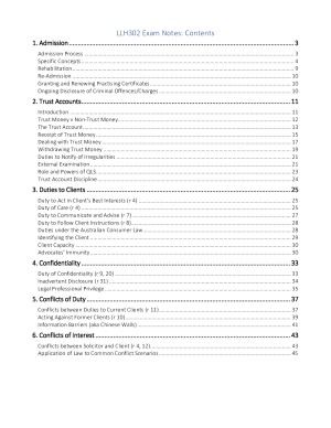 Notes completed by student with GPA just short of 7. All up to date content, perfect for exam performance. Comprehensive, detailed and logical notes covering the entire Ethics & The Legal Profession unit. Notes are arranged according to topic, with clear headings and introductory paragraphs with preliminary information including problem-solving instructions tailored to each topic. Case summaries are included and linked to relevant areas of the notes. ASCR rules are identified using pink text for quick and easy identification.