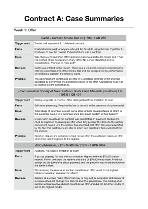 Each case summary contains trigger words, facts, issues, decision and the key legal principle. Offer - Carlill v Carbolic Smoke Ball Co [1893] 1 QB 256 - Pharmaceutical Society of Great Britain v Boots Cash Chemists (Southern) Ltd [1953] 1 QB 401 - AGC (Advances) Ltd v McWhirter (1977) 1 BPR 9454 - Harvela Investments Ltd v Royal Trust Co of Canada (CI) Ltd [1986] 1 AC 207 - Dickinson v Dodds (1876) 2 Ch D 463 - Goldsbrough Mort & Co Ltd v Quinn (1910) 10 CLR 674 - Mobil Oil Australia Ltd v Wellcome International Pty Ltd (1998) 81 FCR 475 - Fong v Cilli (1968) 11 FLR 495 - Laybutt v Amoco Australia Pty Ltd (1974) 132 CLR 57 - Neilson v Dysart Timbers Ltd [2009] NZSC 43; [2009] 3 NZLR 160 - Stevenson, Jaques & Co v McLean (1880) LR 5 QBD 346 Acceptance - Fitness First (Australia) Pty Ltd v Chong [2008] NSWSC 800 - The Crown v Clarke (1927) 40 CLR 227 - Latec Finance Pty Ltd v Knight [1969] 2 NSWR 79 - Brinkibon Ltd v Stahag Stahl und Stahlwarenhandelsgesellschaft mbH [1983] 2 AC 34 - Adams v Lindsell (1818) 1 B & Ald 681; 106 ER 250 - Felthouse v Bindley (1862) 11 CBNS 869; 142 ER 1037 - Empirnall Holdings Pty Ltd v Machon Paull Partners Pty Ltd (1988) 14 NSWLR 523 - Brambles Holdings v Bathurst City Council [2001] NSWCA 61; (2001) 53 NSWLR 153 - MacRobertson Miller Airline Services v Commissioner of State Taxation (WA) (1975) 133 CLR 125 Consideration - Australian Woollen Mills Pty Ltd v Commonwealth (1954) 92 CLR 424 - Beaton v McDivitt (1987) 13 NSWLR 162 - Woolworths Ltd v Kelly (1991) 22 NSWLR 189 - Roscorla v Thomas (1842) 3 QB 234; 114 ER 496 - Ipex Software Services Pty Ltd v Hosking [2000] VSCA 239 - Lampleigh v Brathwait (1616) Hob 105; 80 ER 255 - Stilk v Myrick (1809) 2 Camp 317 - Foakes v Beer (1884) 9 App Cas 605 - Hartley v Ponsonby (1857) 7 El & Bl 872 - Williams v Roffey Bros & Nicholls (Contractors) Ltd [1991] 1 QB 1 - Musumeci v Winadell Pty Ltd (1994) 34 NSWLR 723 - Re Selectmove Ltd [1995] 1 WLR 474 - Pao On v Lau Yiu Long [1980] AC 614 - Wigan v Edwards (1973) 1 ALR 497 Intention - Shahid v Australasian College of Dermatologists (2008) 168 FCR 46 - Ermogenous v Greek Orthodox Community of SA Inc [2002] HCA 8; (2002) 209 CLR 95 - Ashton v Pratt [2015] NSWCA 12 - Todd v Nicol [1957] SASR 72 - Administration of Papua and New Guinea v Leahy (1961) 105 CLR 6 - cf. Placer Developments Ltd v Commonwealth (1969) 121 CLR 353 - Australian Woollen Mills Pty Ltd v Commonwealth (1954) 92 CLR 424 - Kleinwort Benson Ltd v Malaysia Mining Corp Bid [1989] 1 WLR 379 - Commonwealth Bank of Australia v TLI Management Pty Lt. [1990] VR 510 - Banque Brussels Lambert SA v Australian National Industries Ltd (1989) 21 NSWLR 502 - Masters v Cameron - Baulkham Hill Private hospital Pty Ltd v GR Securities Pty Ltd (1986) 40 NSWLR 622 - Godecke v Kirwan (1973) 129 CLR 629 Certainty - Milne v Attorney-General for the State of Tasmania (1956) 95 CLR 460 - ANZ v Frost Holdings Pty Ltd [1989] VR 695 - Foley v Classique Coaches Ltd [1934] 2 KB 1 - Council of the Upper Hunter County District v Australian Chilling and Freezing Co Ltd (1968) 118 CLR 429 - Biotechnology Australia Pty Ltd v Pace (1988) 15 NSWLR 130 - Whitlock v Brew (1968) 118 CLR 445 - Hall v Busst (1960) 104 CLR 2016 - United Group Rail Services Ltd v Rail Corporation of New South Wales [2009] NSWCA 177; (2009) 74 NSWLR 618 - Godecke v Kirwan (1973) 129 CLR 629 - Placer Development Ltd v The Commonwealth (1969) 121 CLR 353 - Meehan v Jones (1982) 149 CLR 571 Formalities - Yeoman Credit Ltd v Latter [1961] 1 WLR 828 - Tonitto v Bassal (1992) 28 NSWLR 564 - Pirie v Saunders (1961) 104 CLR 149 - Ogilvie v Ryan [1976] 2 NSWLR 506 - Pipikos v Trayans [2018] HCA 39 -Coulls v Bagots Executor & Trustee Co Ltd (1967) 119 CLR 460 - Port Jackson Stevedoring Pty Ltd v Salmond & Spraggon (Aust) Pty Ltd (The ‘New York Star’) (1978) 139 CLR 231 - Trident General Insurance Co Ltd v McNiece Bros Ltd (1988) 165 CLR 107 - Gate Gourmet Australia Pty Ltd (in liq) v Gate Gourmet Holding AG [2004] NSWSC 149 Capacity - Waltons Stores (Interstate) LTd v Maher (1988) 164 CLR 387 - Mobil Oil Australia Ltd v Wellcome International Pty Ltd (1998) 81 FCR 475 - Legione v Hateley (1982) 152 CLR 406 - Crown Melbourne Ltd v Cosmopolitan Hotel Pty & Anor [2016] HCA 26 - Je Maintiendrai Pty Ltd v Quaglia (1980) 26 SASR 101 - Sidhu v Van Dyke [2014] HCA 19; (2014) 251 CLR 505 - Giumelli v Giumelli (1999) 196 CLR 101 - Commonwealth v Verwayen (1990) 170 CLR 394 - W v G (1996) 20 Fam LR 49 Express terms - L’Estrange v F Graucob Ltd [1934] 2 KB 394 - Toll (FGCT) Pty Ltd v Alphafarm Pty Ltd (2004) 219 CLR 165 - Fitness First (Australia) Pty Ltd v Chong [2008] NSWSC 800 - Curtis v Chemical Cleaning & Dyeing Co [1951] 1 KB 805 - Oceanic Sun Line Special Shipping Company Inc v Fay (1988) 165 CLR 197 - eBay International AG v Creative Festival Entertainment Pty Ltd [2006] FCA 1768; (2006) - Parker v South Eastern Railway Co (1877) 2 CPD 416 - Causer v Brown [1952] VLR 1 - Thornton v Shoe Lane Parking Lts [1971] 2 QB 163 - Baltic Shipping Co v Dillon (The Mikhail Lermontov) (1991) 22 NSWLR 1 - New South Wales Lotteries Corporation Pty Ltd v Kuzmanovski [2011] FCAFC 106 - Interfoto Picture Library Ltd v Stiletto Visual Programs Ltd [1989] QB 433 - Balmain New Ferry Co Ltd v Robertson (1906) 4 CLR 379 - Rinaldi & Patroni v Precision Mouldings (1986) WAR 131 -State Rail Authority of New South Wales v Heath Outdoors Pty Ltd (1986) 7 NSWLR 170 - Hoyts Pty Ltd v Spencer (1919) 27 CLR 133 - Saleh v Romanous [2010] NSWCA 274 - Crown Melbourne Ltd v Cosmopolitan Hotel Pty & Anor [2016] HCA 26 - Equuscorp Pty Ltd v Glengallan Investments Pty Ltd (2004) 218 CLR 471 - Van den Esschert v Chappell [1960] WAR 114 - JJ Savage & Sons Pty Ltd v Blakney (1970) 119 CLR 435 - Oscar Chess Ltd v Williams [1957] 1 WLR 370v - Dick Bentley Productions Ltd v Harold Smith (Motors) Ltd [1965] 1 WLR 623 - Crown Melbourne Ltd v Cosmopolitan Hotel Pty & Anor [2016] HCA 26 - Codelfa Construction Pty Ltd v St