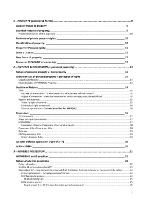 An extremely comprehensive set of property law notes covering relevant statutes and case authorities. ALSO PURCHASE accompanying 'Property Law Case Summaries' document for 44 pages of alphabetised summaries of all relevant cases. This set of notes covers the following topics: - What is property? - Doctrine of fixtures (fixtures and possession) - Adverse Possession - Doctrine of tenure - Native Title - Doctrine of Estates - Leases - Equitable interests - Easements - Restrictive Covenants - Mortgages