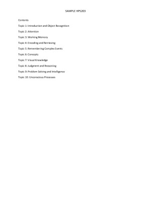 - Includes examinable content from the prescribed textbook (Ch 1, 3-9, 11-14) - Includes content from examinable seminars (week 3, 7 and 9) - Doesn't include content from the 3 live classes as the content may vary - The summarised notes are guided by the study guide questions and revision questions - Topics covered: Topic 1: Introduction and Object Recognition Topic 2: Attention Topic 3: Working Memory Topic 4: Encoding and Retrieving Topic 5: Remembering Complex Events Topic 6: Concepts Topic 7: Visual Knowledge Topic 8: Judgment and Reasoning Topic 9: Problem Solving and Intelligence Topic 10: Unconscious Processes