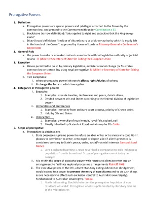 Quick reference scaffolds that are ideal for open book problem question exams. This guide contains a detailed step by step breakdown for each topic. ALSO AVAILABLE: This scaffold is useful alongside the more detailed Public Law Notes (available separately). Topics Include: - Outline of constitutional documents and their history - The constitution its structure and principles - Types of constitutions - Amendment of the commonwealth constitution - Amendment of the state constitutions – manner and form - Representation of the people in the legislature - Right to vote - Qualification and disqualification of members of parliament and disputed elections - The executive - Introduction to executive power - Nationhood power - The capacities of the executive – the powers to contract and spend - Access to government documents - Production of documents ordered by house - Rule – making accountability - Fourth arm of government – integrity bodies - The separation of powers and the meaning of judicial power - The separation of powers (continued) and its effect on federal judges and federal courts - State courts and the exercise of judicial power - Federal detention of individuals and the exercise of legislative and judicial power - Matters and standing before the courts