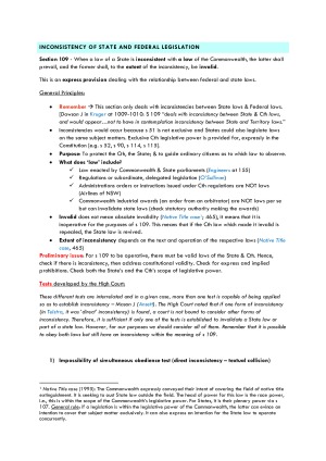 I used these notes for the exam and scored high marks. There are brief details about the cases in the footnotes for a quick glance in the exam if required. I also had access to the recordings for personal reasons and hence the notes are very detailed. Topics: Interpretation External affairs corporations power inconsistency limits of legislative power defence executive power of the commonwealth judicial power and separation of powers state courts and separation of powers federalism and economic union (grants power, taxation, excise duties, interstate trade) Representation & rights (freedom of political communication, voting rights There is also a HYPO STRUCTURE at the end of the topics.