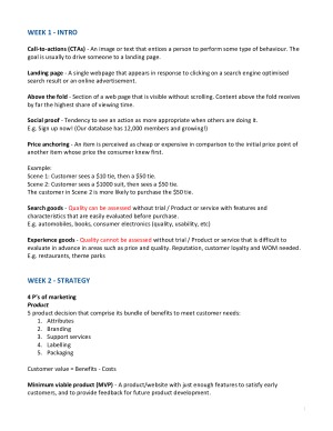 These notes cover the lecture slides, and are easy to read and simple to memorise. I used them for my exam revision and achieved a high H2A. Lecture 1 - Intro Lecture 2 - Strategy Lecture 3 - Web Analytics Lecture 4 - SEO Lecture 5 - SEM Lecture 6 - Web Design & UX Lectures 7 & 8 - Viral Marketing (In week 9, we had a guest lecture) Lecture 10 - Social Media Lecture 11 - Email Marketing