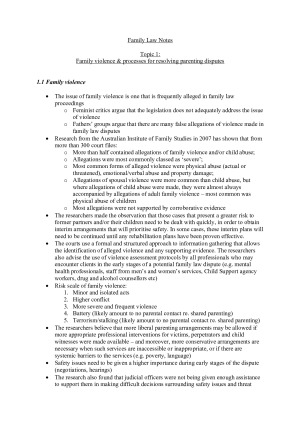 Course notes from Family Law course, derived from the textbook with notes added from class. Includes some practice questions and extracts from legislation. In depth notes on the Property components of the course that are assessed in the final exam. 1. Family violence 2. Legal regulation of families 3. Who is a parent? 4. Parenting disputes 5. Children's issues 6. Best interests of the child 7. Property 8. Property II 9. Property III 10. Financial support - adults and children