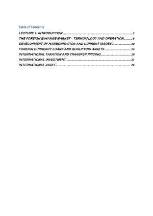 Includes: - Topic notes for revision - Lecture + Tutorial notes required for Final - Examples and practice questions Summarised notes weekly make it so much easier for the final exam TOPICS: - Introduction - Foreign exchange market - Development of harmonisation and current issues - Foreign currency transactions - Hedging transactions - International Taxation and Transfer Pricing - International Investment - International Audit