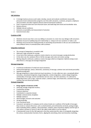 These are a complete, refined and comprehensive set of exam notes that covers all topics for the subject from weeks 1-12. It is an excellent tool to refresh your understanding of key topics and concepts and deepen your knowledge of the subject in preparation for the exam. Please note, the notes include paraphrased relevant information found in the unit textbook! These notes enabled me to achieve a score of 90% overall for the unit, which was the TOP mark for the semester. The topics included are as follows: - What value relationships to communicate: Brands, branding, IMC planning - How communication works: theory overview, models and objectives - Who to communicate to/with/for/between and what to communicate - What to communicate and how to communicate it: creative strategy and execution - Where to communicate: media strategy choices - Where to communicate and how much will it cost: media strategy and budgeting - Deconstructing IMC - Advertising and Sales Promotion - Deconstructing IMC - Direct Response and Digital - Deconstructing IMC - PR, Sponsorship and Events - Broader communication environment: Legal, Ethical and Global perspectives - Evaluation of effectiveness