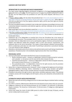 TOPIC LIST: Introduction to Litigation and Dispute Management Procedural Justice Alternative Dispute Resolution Processes Negotiation Mediation Introduction to Civil Litigation Interlocutory Proceedings The Context of Civil Litigation Terminology The Sources of Civil Procedure The Relationship Between Civil Litigation and Social Justice Indigenous Plaintiffs Manus Island Refugees Victims of Sexual Harassment Limitation Periods Limitation Periods Problem Solving Parties Plaintiffs Defendants Third Parties People With Disabilities Amicus Curiae Interveners Consolidating Proceedings Model Litigant Guidelines Class Actions Jurisdiction Representative Proceedings and Class Actions Finality Estoppels Case Management and the Overriding Purpose Jurisdiction Service Inside the Jurisdiction Service Outside of Jurisdiction in Australia Service Outside Australia Substituted Service Service Upon Particular Defendants Originating Process and Commencing Proceedings Defending Proceedings and Appearance Acting for the Defendant Preserving the Evidence Urgent Applications Checklist Anton Piller Orders Search Orders Mareva Orders Freezing Orders Pleadings Subsidiary Rules of Pleadings Structure of the Statement of Claim Defence Pleading a Defence Counter-Claims Reply Third Party Proceedings Challenging Proceedings Mistakes and Amendment Exam Guide Court's Leave to Amend When Must the Court Grant Leave? When May the Court Grant Leave? Granting Leave After the Limitation Period Has Passed Consequences of Amendment Preliminary Discovery Discovery/Disclosure Exam Checklist Notice of Non-Party Production Interrogatories Notices to Admit Subpoenas Resisting Discovery Problem Solving Checklist for Privileges Privileges Client Legal Privilege Professional Confidential Relationships Journalistic Privilege Religious Confessions Settlement Negotiations Self-Incrimination Public Interest Privilege Spousal Privilege? Other Considerations Early Resolution of Claims and Ending Proceedings Early Exam Checklist Discontinuance/Withdrawal Default Judgement Default by the Plaintiff Summary Judgement Abuse of Process Vexatious Litigants Costs Party/Party Costs Solicitor/Client Costs Indemnity Basis Costs Exceptions Special Cases Settlement Making an Offer Offers of Compromise Acceptance of the Offer Non-Acceptance, More Favourable Outcome at Trial Non-Acceptance, Less Favourable Outcome at Trial Non-Acceptance, Loss at Trial Calderbank v Offers of Compromise? Other Issues Judgement Appeals Setting Aside Appealing an Interlocutory Decision Appealing a Trial Judgement Enforcement All notes compiled from Lectures, Tutorials, Readings and Case Studies