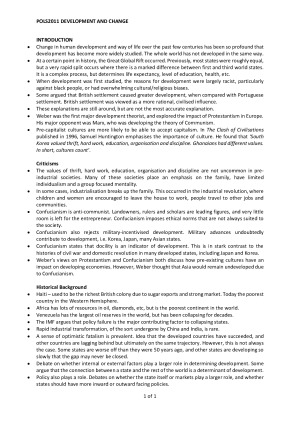 TOPIC LIST: Introduction Criticisms Historical Background Measuring Development The Intention of Development The Origins of Capitalism The World at 1500 Theoretical Perspectives on Development The US Post-War Social Sciences Newly Independent Countries The Cold War Modernisation Theory Structural Functionalism Criticisms of Modernisation Theory Dependency Theory Wallerstein and World-Systems Criticisms Neo-Liberalism The New World Development Interventions Technocracy in the Cold War Concern with Governance Capabilities Approach Democracy and Development Democracy and Semi-Democracy Democracy and the Market Democracy and Capitalism Democracy is a Recent Development Support for Democracy Authoritarian/Military Government Developmentalists The Military in the Developing World Democratic Transitions Third Wave Democratisation post 1974 State-Making, Fragile States, Security Mexico Case Study Fiji Case Study Corruption, Formality, Informality, and Urbanisation Corruption The Informal Economy Theoretical Views of the Informal Economy Informality Structures Slums and Shantytowns Food History What is Hunger? Post WW2 Myths Bangladesh Case Study Other Info El Salvador Melon Case Study Gender and Identity Women in Development Theory Women and Development Theory Gender and Development Approach Women, Environment and Development Foreign Aid Definition and History Provision of Aid Motivations for Aid Views on Aid Problems with Aid Patterns of Aid Development and the Environment Deforestation Loss in Biodiversity Environmental Politics Measuring Our Impact Case Studies