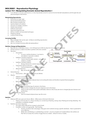 This is a fully comprehensive document containing notes for weeks 10 -12 of reproductive physiology. It is a great subject, yet content heavy so having detailed notes is essential! These notes are great to follow and even contain the little details brought up by lecturers! This set of notes includes the following lectures: - Manipulating Domestic Animal Reproduction I + II - Pregnancy and Pregnancy Complications - Ovarian Diseases and Disorders - Gynaecological Disorders - Diseases and Disorders (Male Infertility) - Sexually Transmitted Infections I have uploaded the earlier weeks as well should you find this style of notes to be helpful. Please feel free to refer to my other listings :)