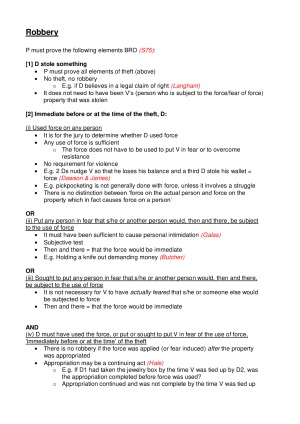 These notes cover all the content you need for the exam and are extremely exam-friendly as they are set out in logical steps [1], [2], [3] etc Super easy to use when doing problem questions, and they helped me pretty much full mark the exam (i lost half a mark) These notes include the following topics: - Criminal Procedure (with updated Bail Act provisions) - Criminal Responsibility and Defences - Strict and Absolute Liability - Drug Offences - Property offences (theft, obtaining property or financial advantage by deception, robbery and burglary) - Attempts - Complicity - Corporate Criminal Liability